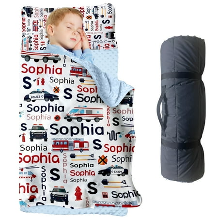 AOLOA Custom Name Toddler Nap Mat Fire Truck and Police Car Theme with Emergency Vehicles Cozy Sleeping Bag Blanket for Kids Perfect for Preschool Daycare Home Travel and Sleepovers