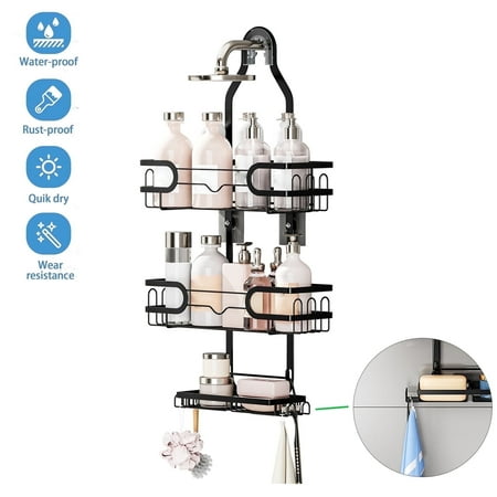 Description: Premium Material: The shower caddy over the shower head is made of featured iron and high-quality black paint.which will not rust after long-term use and is durable. Easy Installation – 3 tier hanging shower caddy over shower head simply assemble the shower rack and place the shower caddy over shower head. There s no worry about drilling holes in the wall. Hollow Design – 3 tier hanging shower caddy over shower head hollow bottom design makes drainage more convenient and allows shower supplies dry quickly to keep the shower caddy s circulation. Size: The Shower Caddy Over Shower Head upper shower shelf measures 12.2*4.72*3.34inch(31*12*8.5cm) the middle measures 11.8*3.93*3.14inch(30*10*8cm) and the lower measures 9.84*3.54*1.2(25*9*3cm). The well-designed shower shelf hanging size provides spacious space for your shower utensils without taking up too much space in the bathroom. Space-Saving Design: Thishanging shower caddy is designed to maximize bathroom space by conveniently hanging over the shower head allowing you to make the most of your shower stall or bathtub area. Specifications: Product Name: 3 Tier Hanging Shower Caddy Over Shower Head Color: Black Material: Iron Size: The upper shower shelf measures 12.2*4.72*3.34inch(31*12*8.5cm) The middle measures 11.8*3.93*3.14inch(30*10*8cm) The lower measures 9.84*3.54*1.2(25*9*3cm) Packing List: 1x Hanging Shower Caddy Over Shower Head