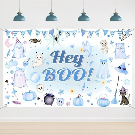 5.9×3.6FT Halloween Hey Boo Baby Shower Backdrop Blue Hey Boo Photography Background Ghost Pumpkin Spider Web Bat Boy Baby Shower Party Decorations Banner Supplies Photo Booth Props