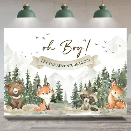 7x5FT Oh Boy Backdrop Let The Adventure Begin Baby Shower Mountain Forest Animals Photography Background for Boys Baby Shower Party Decorations Supplies Banner Photo Booth Props