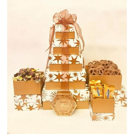 This exquisite holiday gift tower makes a wonderful statement that show your recipient you care enough to send the very best. Five stylish impressed boxes are filled with a variety of scrumptious gourmet treats. This gift is perfect for family friends co-workers associates and neighbors. A complimentary card is included with your personalize message. Included in this Gift: Smoked Salmon Rum Cakes Bites Cheese Spread Crackers Wine & Cheese Biscuits Ghirardelli Milk Chocolate Caramel Squares Ghirardelli Milk Chocolate Sea Salt Cashews Godiva Milk Chocolate Covered Pretzels Caramel Popcorn Cashew Roca Ground Gourmet Coffee
