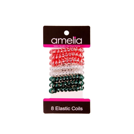 Amelia Beauty s Small Red Silver and Green Mix Colors Sparkly 1.5in Spiral Telephone Cord Coils for Hair. The ultimate solution for effortlessly stunning hairstyles. Engineered with high-quality TPU material these coils offer a waterproof non-absorbent and eco-friendly design. The signature spiralized construction guarantees a secure hold without any snags tangles or creases. Plus they stretch up to 10 inches for easy application and removal ensuring comfort and style in every wear.