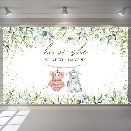 Baby Clothes Gender Reveal Backdrop He or She What Will Baby Be Photography Background Boho Clothes Eucalyptus Leaves Gender Reveal Party Decorations Banner Supplies Photo Booth Props