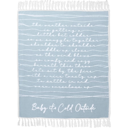 50 long x 60 tall and .5 wide premium throw is made from 400 GSM 100% polyester plush jacquard with thirty-one hand-made knotted tassels at both the top and bottom of each blanket which extends the height of the blanket to 72.5 in total. The excellent packaging consists of a silk white bow-tied ribbon with a gray cardboard band containing material and sizing information. Attached is a thick paper tag with the entire blanket sentiment. The blanket is neatly folded and securely attached to white wood and a silver metal hook hanger. Risen cursive sherpa The Weather Outside Is Getting A Little Bit Colder So We Snuggle Together Shoulder To Shoulder. Cuddle Up Close As The Wind Blows So Comfy And Cozy Beneath This Throw. Let s Sit By The Fire With A Nice Toasty Cup To Settle In And Warm Ourselves Up. Baby It s Cold Outside sentiment is conveyed by wave-like thread lines connecting the ends of the words to the edge of the blanket on beautiful soft blue background. Machine wash cold on a gentle cycle with like colors. For best results hang or lay flat to dry. It can be tumble-dried on a low setting for 20 minutes. Never bleach or iron.
