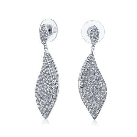Stand out with dazzling daring silver-plated CZ wave statement dangle earrings. Rhodium adds extra shine. Perfect for red carpet or bridal jewelry.