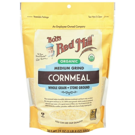 Organic. USDA Organic. Certified Organic by QAI. 100% Whole Grain: 38 g or more per serving. 100% or the grain is whole grain. WholeGrainsCouncil Our cornmeal makes incredibly delicious cornbread and here s why: we leave the corn germ and bran in. It s 100% stone ground which results in cornmeal that isn t just tasty-it s a good source of fiber too. You ll find it s also the ideal texture for muffins pancakes waffles and a host of other baked goods. You Can See Our Quality. DEAR FRIENDS Corn is perhaps the most traditional of American foods: domesticated thousands of years ago it s been a cultural and nutritional mainstay ever since. At Bob s Red Mill we mill our cornmeal from the finest-quality golden corn stone ground the old-fashioned way on our millstones to preserve all of the vital nutrients and flavor-we ve loved for generations. To your good health Bole Moone. bobsredmill For more recipes at bobsredmill For information and recipes visit bobsredmill Resealable bag.