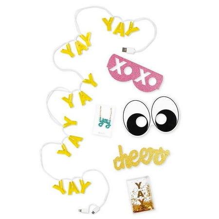 Hold an instant celebration with this Yay kit from Celebrate Shop Packed with goodies such as fun lights a festive picture frame and a stylish necklace 60-inch Yay phone charging light strand Includes 19-inch length necklace Selfie prop glasses with glitter Acrylic picture frame with floating golden glitter