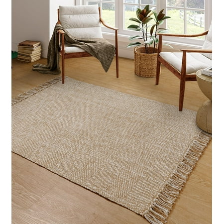 Comfy Area Rug 4 x 6 Tan/Cream Woven Cotton Bedroom Rugs Modern Indoor Accent Rug Floor Carpet with Tassel for Living Room Nursery Room Dining Room Bedside Office Patio Decor
