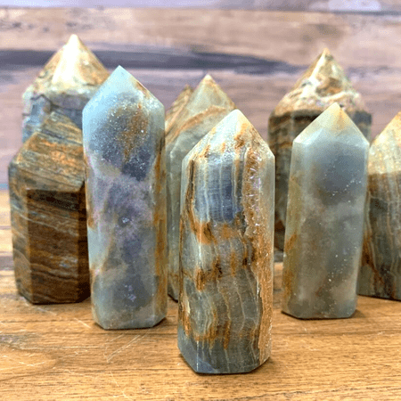 The Blue Onyx Polished Pillar from Brazil is a stunning decorative piece that combines the beauty of nature with skilled craftsmanship. Measuring 2 to 3 inches in height and weighing under 0.5 lbs this pillar adds an elegant touch to any setting. Whether used for interior design as an outdoor accent or for spiritual and healing practices its smooth polished finish enhances its vibrant blue bands and unique patterns. Blue Onyx a variety of chalcedony in the quartz family is prized for its distinct color spectrum ranging from soft pastel blues to deeper striking hues. In addition to its aesthetic appeal Blue Onyx is associated with metaphysical properties believed to promote emotional stability alleviate sadness and boost self-confidence. Each Crystal Joys Blue Onyx Pillar is a natural non-fabricated stone ensuring that every piece is truly one-of-a-kind. Slight variations in color size and pattern make your pillar a unique treasure perfect for collectors or as a thoughtful gift.