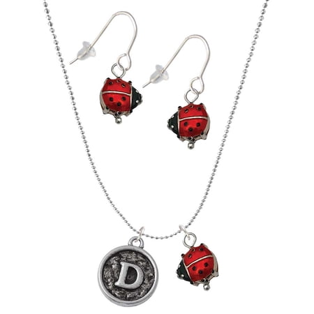 Antiqued Round Seal – Initial – D – Red Lucky Ladybug Necklace and Dangle Earrings Set. Charm size is approx. 0.75 x 0.63 x 0.11 inches (HxWxD) not including loop. This adorable hand painted enamel ladybug is approximately 0.5 inches wide and 0.4 inches long. Ladybugs are good luck symbols and said to give blessings. This female jewelry set comes with an 18 inch faceted ball chain necklace that has a spring ring clasp. The necklace chain is light weight and sparkly. French earrings are stainless steel hooks. PLEASE NOTE: Our products are lead safe but are not intended for children 14 years and younger.
