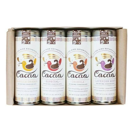 A sweet kraft gift-ready box encloses four beautiful tins of our organic heirloom cacao blends – each filled with 3.5 oz of drinking chocolate. Handcrafted using the finest single-source sun-dried heirloom cacao. Tins are made in the USA of recycled steel. Makes a great Gift. Product of Bellingham USA. 25 oz Organic Certified Package contains: Cacao Especial: Heirloom cacao pure vanilla bean and sun-dried cane crystals blend for the perfect cup. Ingredients: organic cane crystals organic raw heirloom cacao organic vanilla bean Cacao Chokola: A dash of local red chilies spice up our Mexican-inspired cacao blend. Ingredients: organic cane crystals organic raw heirloom cacao organic cinnamon organic cardamom organic allspice organic chilies organic vanilla bean Cacao Lavender Mint: Heirloom lavender and peppermint combine with our raw cacao for a rich aromatic cup. Ingredients: organic cane crystals organic raw heirloom cacao organic lavender powder organic vanilla bean organic peppermint essential oil organic lavender essential oil Cacao Vanilla Orange: A splash of citrus and sweet vanilla bean combine for a festive cup of cacao. Ingredients: organic cane crystals organic raw heirloom cacao organic sweet orange powder organic vanilla bean organic sweet orange essential oil *See product packaging label for additional information on nutrition ingredients and allergens Dimensions: 8.25 x 5.75 x 2.25
