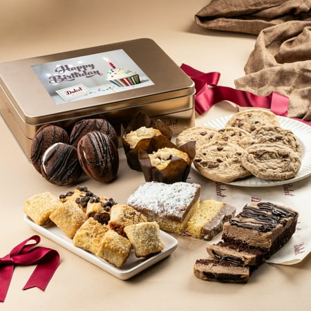 The perfect gift basket where sweetness and decadence meet to form something heavenly. Enjoy the cookies with the full knowledge that they are baked from the finest ingredients like Belgian chocolate and Grade-A eggs. Ranging from black and whites sprinkle cookies chocolate chip and oatmeal this basket is full of freshly baked pastries that make a delicious gift! Everyone appreciates being thought of on their special day. A sophisticated tin holder contains brightly decorated cookies sinfully delicious brownies and other baked goodies. Far more appreciated than the standard gift these gastronomically delightful gifts are the way to go for a great birthday gift! Pack of 22