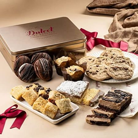 Dulcet Gift Baskets Baked Goods Gift Boxes with Whoopie Pies Muffins Cookies Crumb Cake-22 Counts. The perfect gift basket where sweetness and decadence meet to form something heavenly. Enjoy the cookies with the full knowledge that they are baked from the finest ingredients like Belgian chocolate and Grade-A eggs. Ranging from black and whites sprinkle cookies chocolate chip and oatmeal this basket is full of freshly baked pastries that make a delicious gift! Everyone appreciates being thought of on their special day. A sophisticated tin holder contains brightly decorated cookies sinfully delicious brownies and other baked goodies. Far more appreciated than the standard gift these gastronomically delightful gifts are the way to go for a great birthday gift!