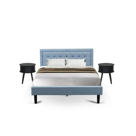 This upholstered wooden set for bedroom is great to offer a stunning appeal to any bedroom. It is time to provide your master bedroom a major style update with this upholstered wood queen bed frame. We are offering a 3 piece bedroom set for bedroom that contains 1 wood bed frame with a headboard and 2 eye-catching mid century nightstands. This denim blue linen fabric fannin upholstered bed elevates the appeal of any bedroom to a luxurious level. Our exclusive creation bedroom set will surely feel comfortable when sitting on this platform bed and its plywood slats are great to supply ample support as well as the sturdy equidistant slats boost durability and extend the life. Everything required for assembly is efficiently packaged no additional instruments are needed for this bedroom set and all you have to do is to install the bed together with your family or friends in a short time and enjoy the happiness of creativity. Features: Materials: Engineered wood Finish: Denim blue black Package includes 1 platform bed frame and 2 night stands for bedrooms. Note: Platform bed frame headboard footboard and hardwood slats are provided. the mattress will not be included in this wingback bed set. This 3 piece queen bed set furniture includes a modern bed and 2 night stands for bedrooms to attract everybody who comes to your home The modern design with linen fabric head board decoration will add luster to any room in a unique way Enhance your bedroom with this gorgeous versatile style queen bed set furniture to offer a unique appeal Our appealing wooden set for bedroom color is rich and long-lasting Our wood queen bed frame legs are finished in black by highly skilled carpenters to provide a modern flair to any living area and the color of the queen wood bed frame headboard is denim blue The nightstand is finished in navy blue This comfortable design queen bed set furniture is constructed by using the top quality materials of engineered wood to have an extremely strong product sure to last years This platform bed with strong support for your mattress will provide a soft and comfortable feel in every style The well crafted modern nightstands are a perfect combination of fashion and functionality The design 6-legs modern bed is intended with graceful button tufted diamond patterns on the head board in linen fabric that lends any space an attractive appeal perfect for contemporary or traditional styles Our modern nightstands have a touch of convenient innovative living and simple to maintain You can clean this bedroom set with the help of a dry cloth or furniture cleaners Specifications: Bed Dimensions: 41 H x 59 W x 89 D Product Weight: 135 lbs Nightstand Dimensions: 22 H x 19 W x 20 D