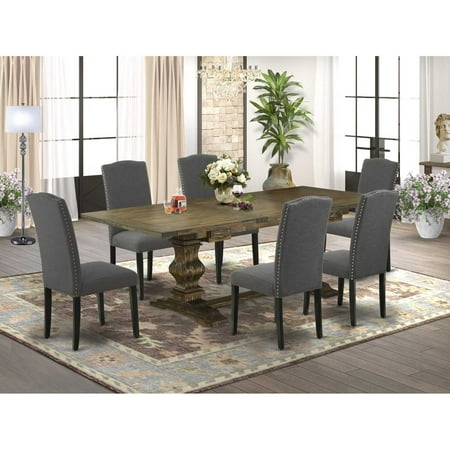 Table Top- Table Pedestal Parson Chairs LAEN7-71-20 EAST WEST FURNITURE 7-PC DINING TABLE SET WITH 6 STUNNING PARSON DINING CHAIRS AND RECTANGULAR DINING TABLE It Kitchen Dining Room Set includes 6 amazing kitchen chairs and a wonderful Pedestal legs dinette table. The Kitchen Dining Room Set delivers an Distressed Jacobean solid wood dining room table and great kitchen chairs that will boost the magnificence to your living area. This dining room table is built from good quality rubber wood. These kitchen chairs have made of high-quality wood that can Endurance to 300lbs weight. This Rectangular Wood Dining Set has colored with a high quality Distressed Jacobean and Black finish. The upholstered dining chairs is one of the most important pieces of furniture in your house. It not only becomes the place to eat meals but it s where you end up working on vegetables cut and spending time with family and friends. You can also use it for casual home parties. That s why it s important to find a Wooden Dining Room Set that fits your personality and uses the space wisely. The options are endless so it s important to pick what works best for you. If you are looking to bring a contemporary glance to your kitchen or dining room this Kitchen Set might be the perfect choice. This kitchen table and parson dining chairs are ideal for any room décor. Bring a rustic trendy seem to your dining area with this set that seat 6 people around the modern dining table. You can clean this Wooden Dining Room Set easily with any furniture clearance. This Kitchen Set assembles easily because of its simple design. You can build this Dining Room Set one place to another quickly. Just because you have a small area or for your wood kitchen table does not mean you have to sacrifice on quality or glance. Keep enjoying with East West furniture! Features: Modern Dining Chairs Frame Material: Rubber Wood Dining Table Frame Material: Asian Wood Table Top and Legs Color: Distressed Jacobean finish Chairs Legs Color: Black finish Chair Seat Material: Linen Fabric Seat Chair Seat Color: Dark Gotham Gray Table Top Style: Rectangular Top Chair Back Style: Stylish Back Dimensions of small dining table: Length 68/92; Width 42; Height 30. Proportions of parson chair: Length 23; Width 18; Height 40. Included in the package: 6 attractive parson dining chairs and a wonderful wood kitchen table. The wood dinette set provided 6 gorgeous Parson dining chairs and dining table that boost the charm of your amazing dining area as well as kitchen. This rectangle dinette set style is so wonderful that’s a reason this wooden dining table set is match These dining chairs Set of 6 set features comfortable Dark Gotham Gray Linen Fabric seat and Black finish Durable Asian Solid wood High back Linen Fabric and Classy Legs We have colored this Distressed Jacobean excellent rectangle dining table with Our wood delivers great stability and durability which makes this dinette set. wood dining table set is made of Asian wood is also known as rubberwood. Our beautiful wooden dining table set for long-lasting and many years to use because this dining Dinette set is consists of Asian wood frame rich finish cutting edges and Linen fabric seat and stylish back. The frame offer fantastic stability breakfast table and upholstered dining chairs finish gives deluxe seem and fabric seat wonderful sitt Dimensions of the good rectangle dining room table are: Length 68/92; Width 42; Height 30; Dimensions of living room chairs Set of 6 are: Length 23; Width 18; Height 40 Rectangle dinette set is simple to build and you can put together quickly this wood dining table set one place to another place. When you will build this small dining table and parson chairs you need to take the help of one another person. This wood dining room table and dining chairs are simple to clean. You can clean this mid century dining table and Parson dining…