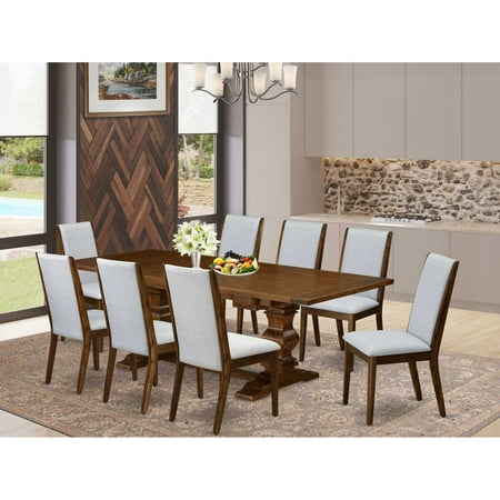 Table Top- Table Pedestal Parson Chairs LALA9-88-05 EAST WEST FURNITURE 9-PC DINING TABLE SET WITH 8 INCREDIBLE PADDED PARSON CHAIRS AND DINING ROOM TABLE Our Dining Room Set consists of 8 beautiful kitchen chairs and a wonderful Pedestal legs dining room table. The Kitchen Set provides an Antique Walnut wooden rectangular dining table and great kitchen chairs that will improve the beauty to your dining room. This wood kitchen table is produced from top quality rubber wood. These parsons chairs have built from superior quality wood that can Endurance to 300lbs weight. This Kitchen Set has colored with a high quality Antique Walnut finish. The padded parson chairs is one of the most important pieces of furniture in your house. It not only becomes the place to eat meals but it s where you end up working on vegetables cut and spending time with family and friends. You can also use it for casual home parties. That s why it s important to find a Wood Dining Set that fits your personality and uses the space wisely. The options are endless so it s important to pick what works best for you. If you are looking to bring a contemporary seem to your kitchen or dining room this Dining Room Set might be the perfect choice. This dining room table and upholstered dining chairs are ideal for any room décor. Bring a rustic trendy glance to your dining area with this set that seat 8 people around the modern dining table. You can clean this Kitchen Set easily with any furniture clearance. This Rectangular Wood Dining Set assembles easily because of its simple design. You can assemble this Wood Dining Set one place to another quickly. Just because you have a small area or for your wood kitchen table does not mean you have to sacrifice on quality or appearance. Keep enjoying with East West furniture! Features: Kitchen Chairs Frame Material: Rubber Wood Dinner Table Frame Material: Asian Wood Table Top and Legs Color: Antique Walnut finish Chairs Legs Color: Antique Walnut finish Chair Seat Material: Linen Fabric Seat Chair Seat Color: Modern Gray Table Top Style: Rectangular Top Chair Back Style: Stylish Back Dimensions of small dining table: Length 68/92; Width 42; Height 30. Dimensions of parson chair: Length 24; Width 20; Height 39. Included in the package: 8 gorgeous padded parson chairs and a wonderful living room table. The dining table set included 8 mid century dining chairs and kitchen table that enhance the beauty of your gorgeous dining room as well as kitchen. This modern dining table set design is so charming that’s a reason this set is match with any dining Dining room chairs set features relaxed Modern Gray Linen Fabric seat and Antique Walnut finish. We have colored this Antique Walnut small rectangular dining table with an irremovable and rich finish. which generates the best high-class coloring effo This wood provides great balance and sturdiness which makes this kitchen dining table set. Wood dining set is made of Asian wood is also known as rubberwood. Our amazing modern dinette set for long-lasting and many years to use because this dining r Wood Dining Set is consists of Asian wood frame rich finish cutting edges and Linen fabric seat and elegant back. The frame deliver amazing stability rectangular table and mid century modern chairs finish delivers high quality glance and fabric se Dimensions of the terrific rectangle dining set are: Length 68/92; Width 42; Height 30; Dimensions of kitchen chairs set of eight are: Length 24; Width 20; Height 39 Modern Dinette Set is easy to construct and you can put together easily this dining room set one place to another place. When you will build this wood table and dining room chairs you need to take the help of one another person. This dining table and kitchen parson chairs are simple to clean. You can clean this dining room table and modern dining chairs with the damp cloth and cleaning brush. This dining…