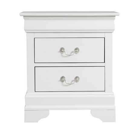 Glory Furniture Louis Phillipe Night Stand in White Color The Glory Furniture nightstand from the Louis Phillipe collection embodies a blend of contemporary style and practical functionality. In a sleek white finish it brings a crisp and inviting aesthetic to your bedroom decor. Constructed with a wood veneer paired with a robust framework this piece ensures durability while the interlocking dovetail joints enhance its strength. With overall measurements of 24 H 22 W and 16 D it provides generous storage space with two drawers ready to hold your bedside essentials. The drawers glide effortlessly on smooth tracks and are equipped with a specialized stopper that helps them remain securely in place when extended making it user-friendly and safe for everyone. Featuring premium hardware that resists tarnishing this nightstand is designed to maintain its pristine appearance over the years. Your new addition comes ready for use straight out of the box so you can enjoy your updated space right away. Explore the variety of colors available to complement your room s decor. This nightstand is carefully packaged to ensure it arrives in excellent condition reflecting a commitment to delivering an exceptional product. Dimensions of 24 H X 22 W X 16 D provide compact but ample storage for all your bedside items. With a striking white finish this nightstand enhances your bedroom s aesthetic effortlessly. Strong dovetail joints ensure lasting durability and reliability for everyday storage solutions. Constructed with a mix of wood veneer and solid wood this piece guarantees longevity and strength. Secure Packaging – All Glory Furniture items come in thick protective packaging to insure safe delivery. Glory Furniture takes great pride in customer satisfaction and goes the extra mile with packaging for safe shipping.