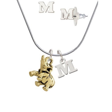 Gold Tone 3-D Elephant – M Initial Charm Necklace and Stud Earrings Jewelry Set