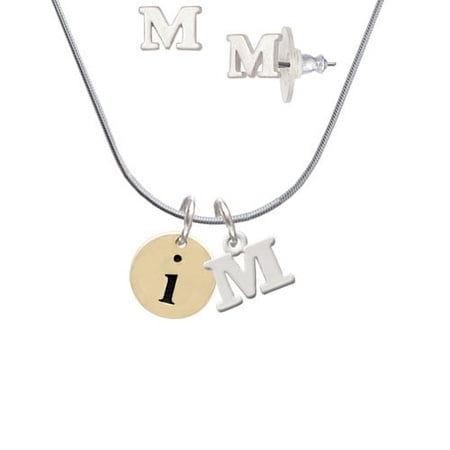 Gold Tone Disc 1/2 Initial – i – – M Initial Charm Necklace and Stud Earrings Jewelry Set