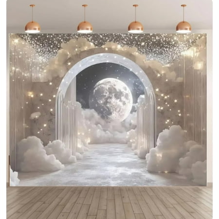 Indoor Baby Photo Backdrop White Clouds Moon Baby Shower Photography Background Glitter Stars White Wall Baby Shower Birthday Party Decorations Banner Supplies Photo Booth Props