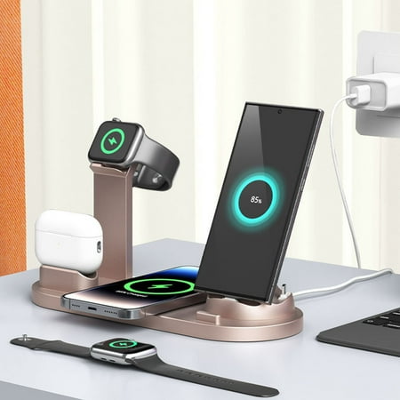 Hi my dear angel welcome to Jacenvly our products are cheap and good quality price is fair you can t miss it. If this product is not your style please click on our store we have many kinds of products there will be you like and suits you. If you have any questions about your purchase please send us the first message we offer world class customer service to make your purchase without your worries. Have a nice day. 15W Six-in-one Wireless Charging 360° Rotating Charger Wireless Fast Charging Smart Watch Charging Stand Wireless Earphone Charging Base Features: Multi-purpose: charging different devices at the same time charging intelligent identification devices charging without interference at the same time charging multiple devices without waiting. Smart power off: low temperature charging is not hot when the device is quickly filled into the trickle charging mode delaying the battery life of the device. Wireless sensitive induction: that is put and charge ≤5mm sensitive induction with a mobile phone case can also support charging. Make your desktop cleaner get of the shackles of the cable charging more convenient and tidy say goodbye to the messy office more comfortable. A variety of scenarios: desktop support/home/watching TV/live/office/counter/travel. Product Description: Parameters: Product name: second generation multi-function wireless charging Model: BXD-07A Color: White black Rose gold Input: DC5V-3A 9V-2A Charger output: 5V-2A Wireless charging output: 5W-7.5W-10W-15W(MAX) Headphone output 5W Watch output: 3W Product size: 23*9*6cm Package size: 24.5 * 10.9 * 5.8cm Weight: 260g Includes: 1x 6-in-1 wireless charging