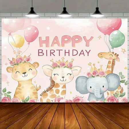 Jungle Animals Happy Birthday Backdrop Pink Rose Safari Animals Baby Shower Photography Background Rose Crown Animals Pastel Balloons Birthday Party Decorations Banner Supplies Photo Booth Props