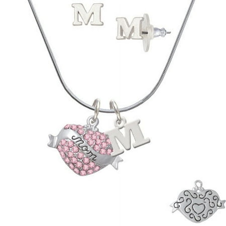 Mom Banner on Pink Crystal Heart – M Initial Charm Necklace and Stud Earrings Jewelry Set