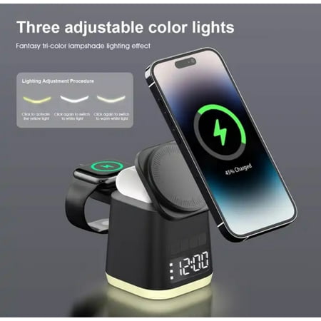 [6 in 1 Multi-function] Strong Magnetic 15W Fast wireless charging station with a digital alarm clock & Night light charger for iphone Watch AirPods The charging station for multiple devices save space and cost for you! [15W for Phone Charging 2.5W for Watch Charging 5W AirPods Charging] enjoy fast wireless charging. After many extreme tests and feedback from fans we use high-power charging chips and world-class electronic components to ensure the quality of the phone charging station! [All in One Wireless Charging Station for fast charging] This charging station with a clock can be set to 12 /24-hour mode It has sleep-friendly brightness control perfect for a nightstand or bedside to get you up and out on time! [Portable & Foldable Travel Charger] This wireless charging station is suitable for your home and office and if you are traveling or on a business trip bring this 6 in1 charger which can charge multiple devices at once. The wireless phone charger charging in landscape or portrait! [More User-friendly And High Quality Design] over-voltage protection and over-temperature protection as well as foreign object detection function. Reasonable internal circuit design can prevent overcharge damage to the equipment battery and ensure safe charging of the device! [Perfect Gifts for Families Friends for him/her] The latest 2024 stylish all in 1 Wireless charger With alarm clock and night light functions